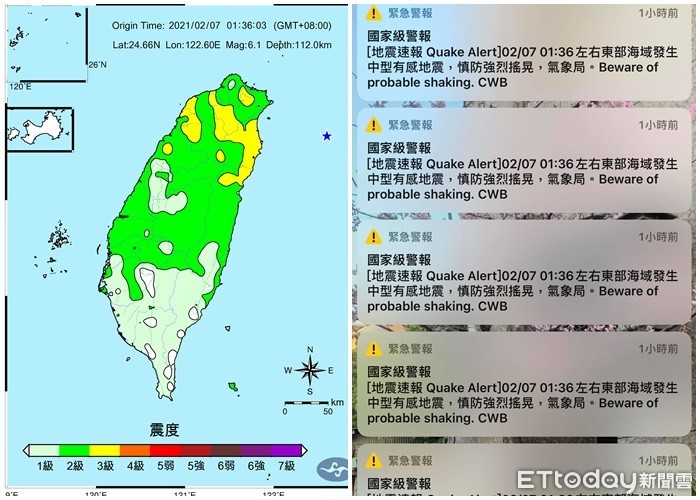 台灣7日凌晨1時36分發生規模6.1有感地震,地震震央位於宜蘭縣政府東方85.1公里(東部海域),地震深度112公里,最大震度4級。不過這次國家級警報不但比地震提早先發出,還連發14次。讓許多民眾上網直說「比地震還驚人!」對此,氣象局也回應了。