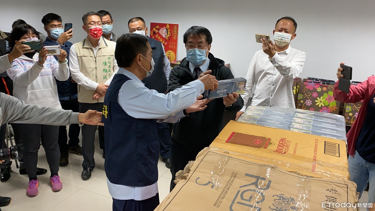 ▲海巡署偵防分署台南查緝隊等單位,查獲大型貨車載運價值1千多萬元未稅私菸,台南市長黃偉哲親自到場視察鼓勵破案有功單位。(圖/記者林悅攝,下同)