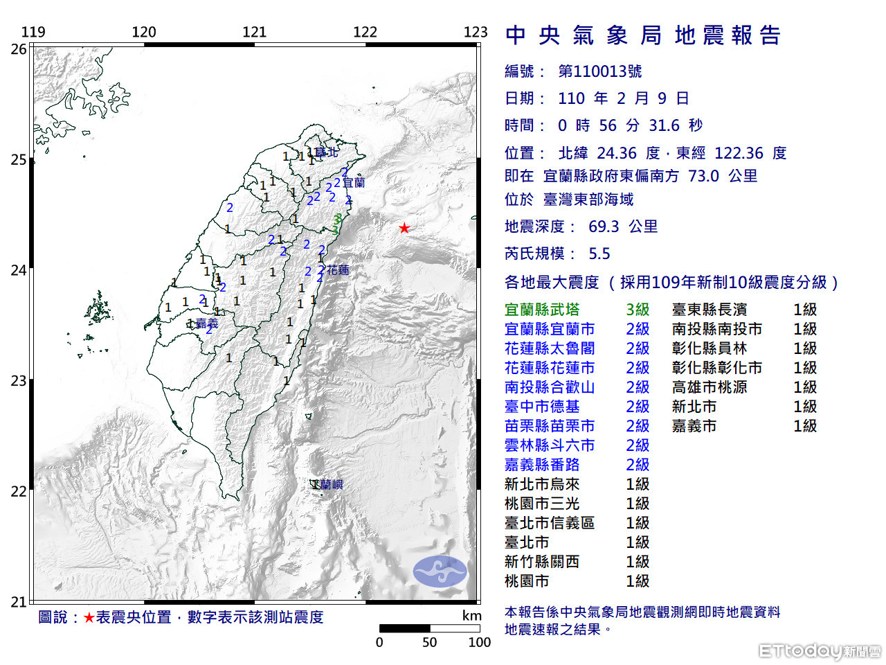 ▲9日凌晨00:56發生規模5.5地震。(圖/氣象局)