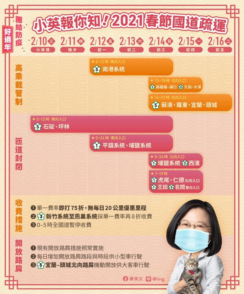 春節連續假期明天展開,不少民眾準備開車返鄉,部分國道匝道自10日零時起封閉。總統蔡英文也透過臉書提醒國人,國道管制措施,另也呼籲國人搭乘大眾運輸要戴口罩,一起團結防疫好過年。