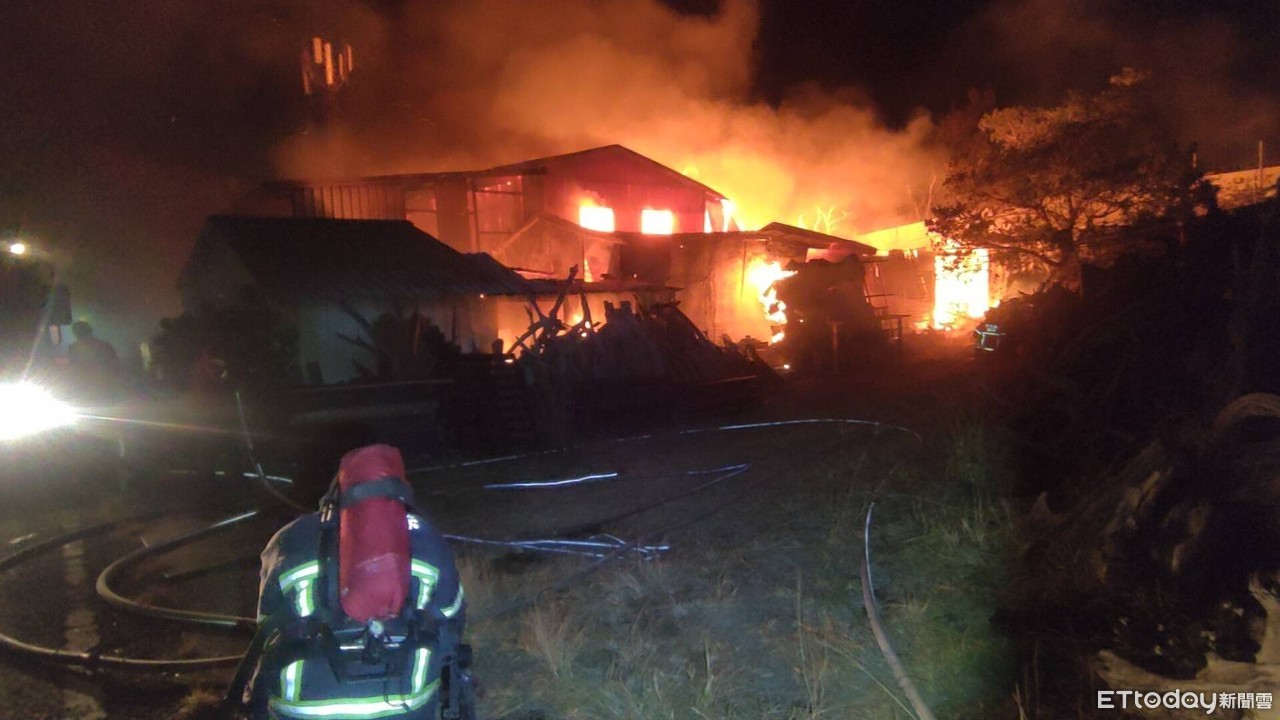 ▲苗栗縣通霄鎮1間雕刻工廠,8日晚間9時許發生大火,由於現場堆滿易燃物品,火勢一發不可收拾。(圖/記者黃孟珍翻攝,下同)