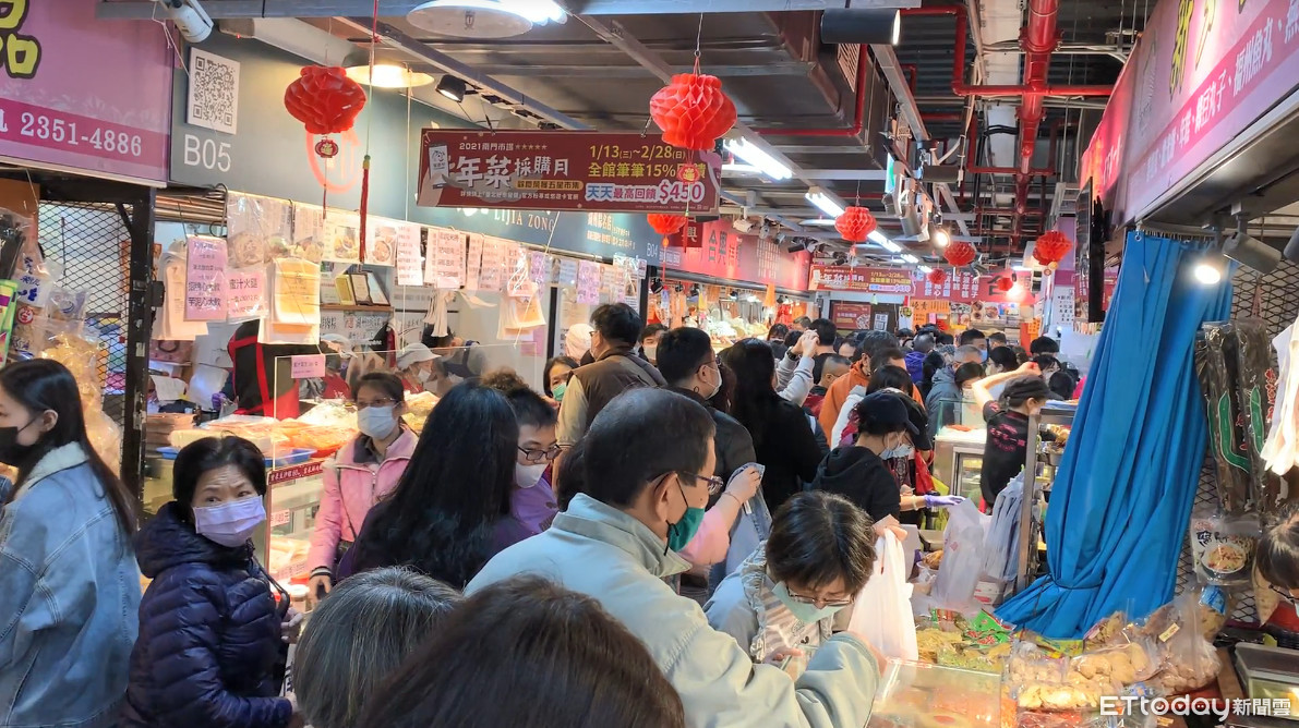 今年台北年貨大街取消,但市場還是有不少民眾搶買年貨,今(10日)是小年夜,一早八點到南門中繼市場看到不少民眾,一早全家出動來採買,包括了熟食區、手工蛋餃、海產攤和雞鴨魚肉攤位都是民眾搶購重點。