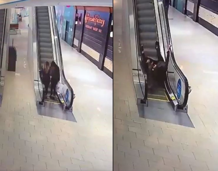 根據網路上流傳的這則監視器畫面,兩名長髮女子先是提著購物袋走上向上的手扶梯,不過從畫面中可以看到,在搭上手扶梯之前,其中一人的步伐就已經有點搖晃,站在右邊的黑髮女子幾乎整個人靠在左方的朋友身上。而當兩人走上手扶梯之後,黑髮女子突然整個人重心不穩往左後方倒下,被她勾著的朋友就這樣瞬間失去平衡被拉倒。