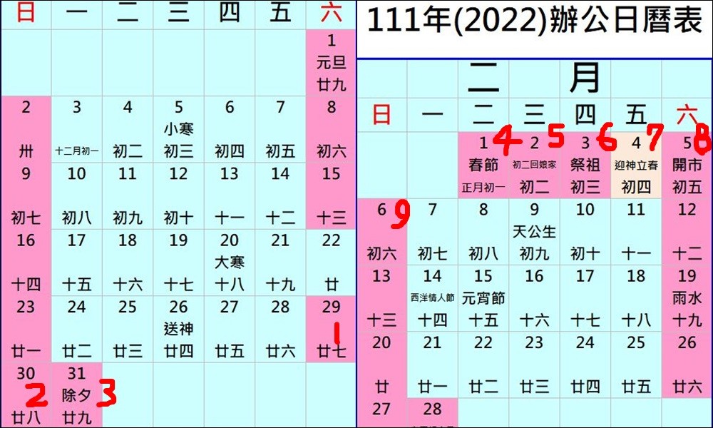這位網友貼出「111年(2022)辦公日曆表」,只見明年的除夕落在1月31日周一,剛好到初六是周日,不僅放滿一整個禮拜,加上除夕前兩日也是周六日,等於明年年假一放就是2+7=9天。貼文讓不少人超興奮,「加油!再整整一年就可以放9天了」、「9天好啊,希望明年可以出國過年(過年就是要出國才是王道)。」