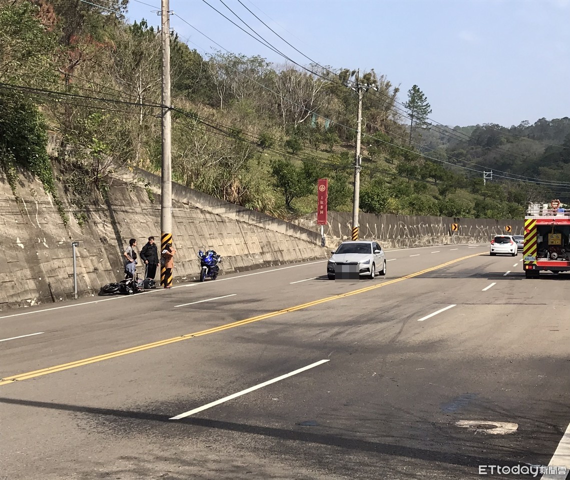 ▲新竹縣峨眉鄉台3線16日上午發生一起自摔車禍事故。(圖/記者陳凱力翻攝,下同)