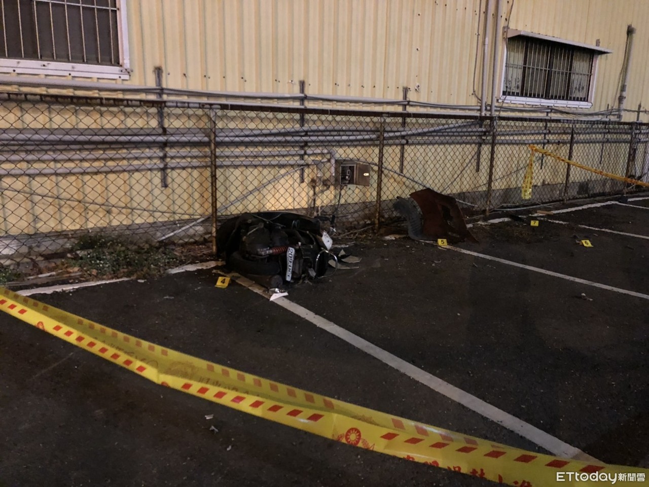 ▲兇嫌自後撞擊死者所騎的機車,撞到保險桿也掉落現場,永華路停車場地上血跡斑斑。(圖/記者林悅攝,下同)