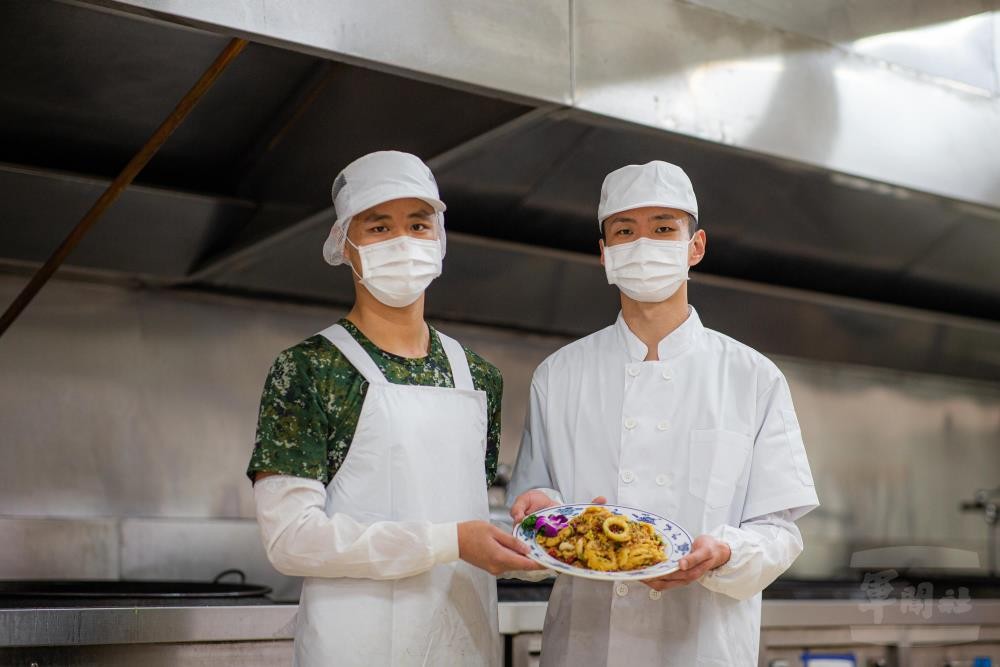 備餐作業時間一到,陸軍21砲指部砲2營伙房官兵,在食勤副組長姚經業下士的帶領下,每個人各司其職專注在自己負責的站台,其中一位,是姚經業的親弟弟-一兵姚瀚軍,兄弟倆在入伍前都曾在餐廳擔任學徒,不僅磨練了一手好工夫,更將所學帶入軍中,讓官兵能大飽口福。