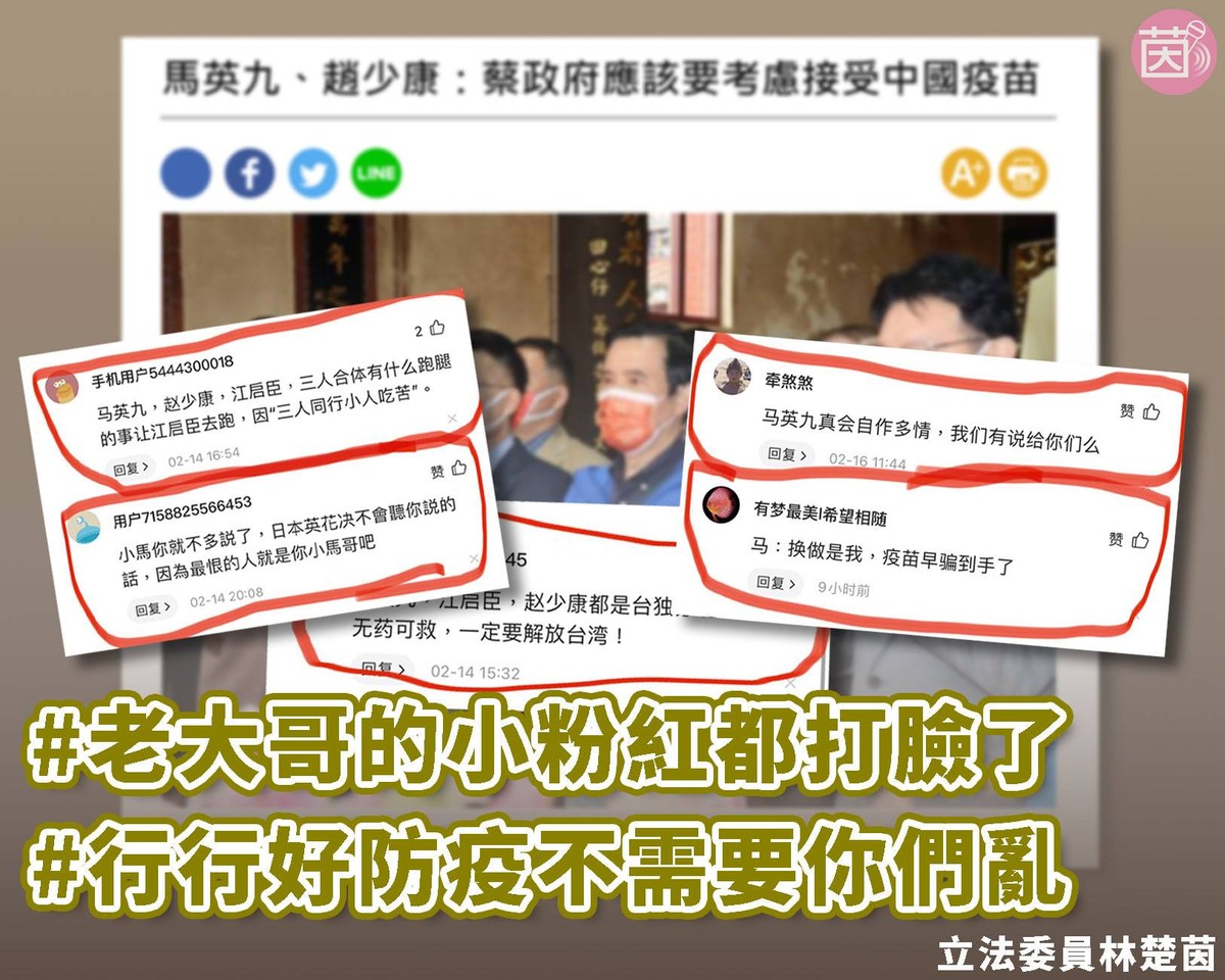 前總統馬英九日前表示,如果中國大陸要提供新冠肺炎的疫苗給台灣,台灣不要馬上拒絕;中廣董事長趙少康也說,將來能拿到別的國家疫苗當然很好,「但是沒有的話,何必一定要排斥」。對此,民進黨立委林楚茵表示,中國老大哥從未說過要賣台灣,「行行好防疫不需要你們亂」。