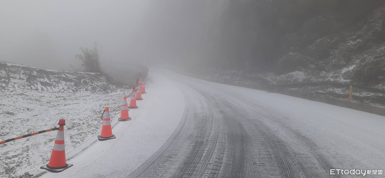 因強烈大陸冷氣團影響,公路總局18日對外公告,台14甲線武嶺至合歡山莊(31~33K)部分背陽面因路面結冰限加掛雪鏈通行,同時限制機車、重機及乙類大客車均禁止進入。