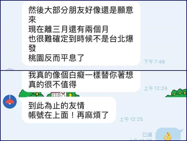 「我以為妳會說,不管怎樣妳都會來我的婚禮」,新娘話鋒一轉,表示她當初義無反顧參加原PO的婚禮,認為對方應該用同樣的態度相挺,但如今聽到建議改地點,覺得非常難過,「我發現妳好像不會換位思考」。對此,原PO坦言把新娘當好朋友,才會認真給予建議,而新娘也在4天後回一個「OK」的手勢圖案。
