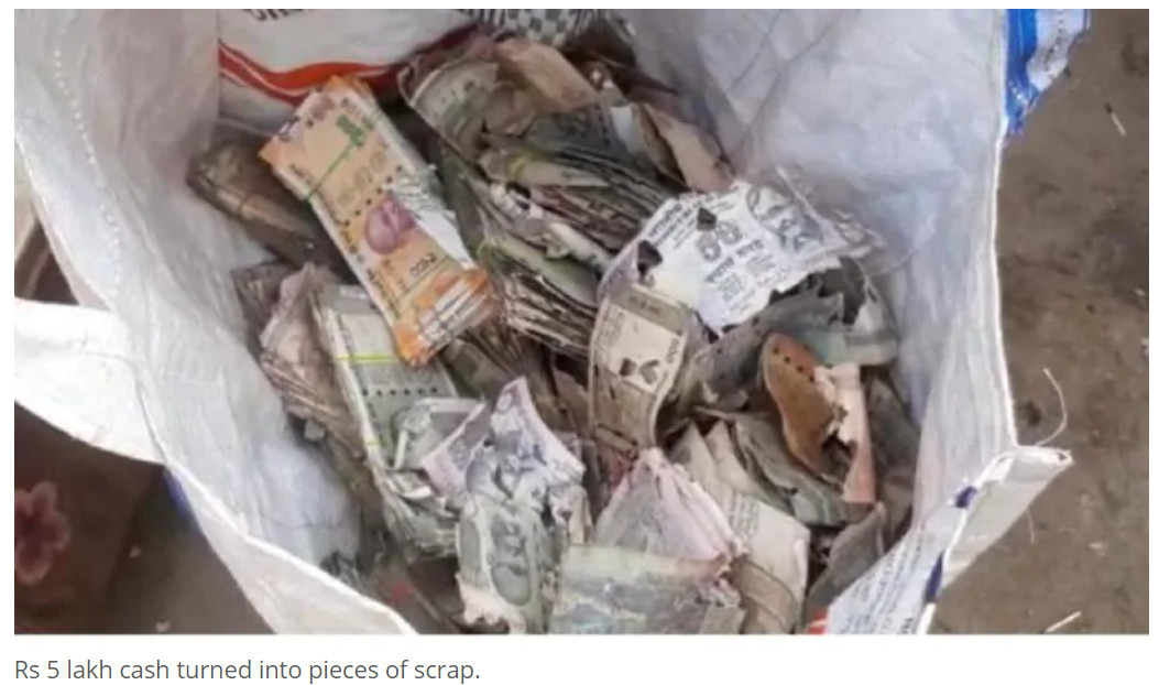 《今日印度》報導,居住在克利須那縣(Krishna) Mylavaram村的52歲男子賈瑪拉雅(Bijili Jamalayya),平時養豬維生的他都是現金交易,便習慣把紙鈔直接存放在家中一個鐵製行李箱中,而不是存到銀行,近來為了修繕房子才打開行李箱,沒想到存款遭到白蟻啃食,許多500元與200元的鈔票都被啃出大洞根本不能使用,當下只能崩潰大哭。