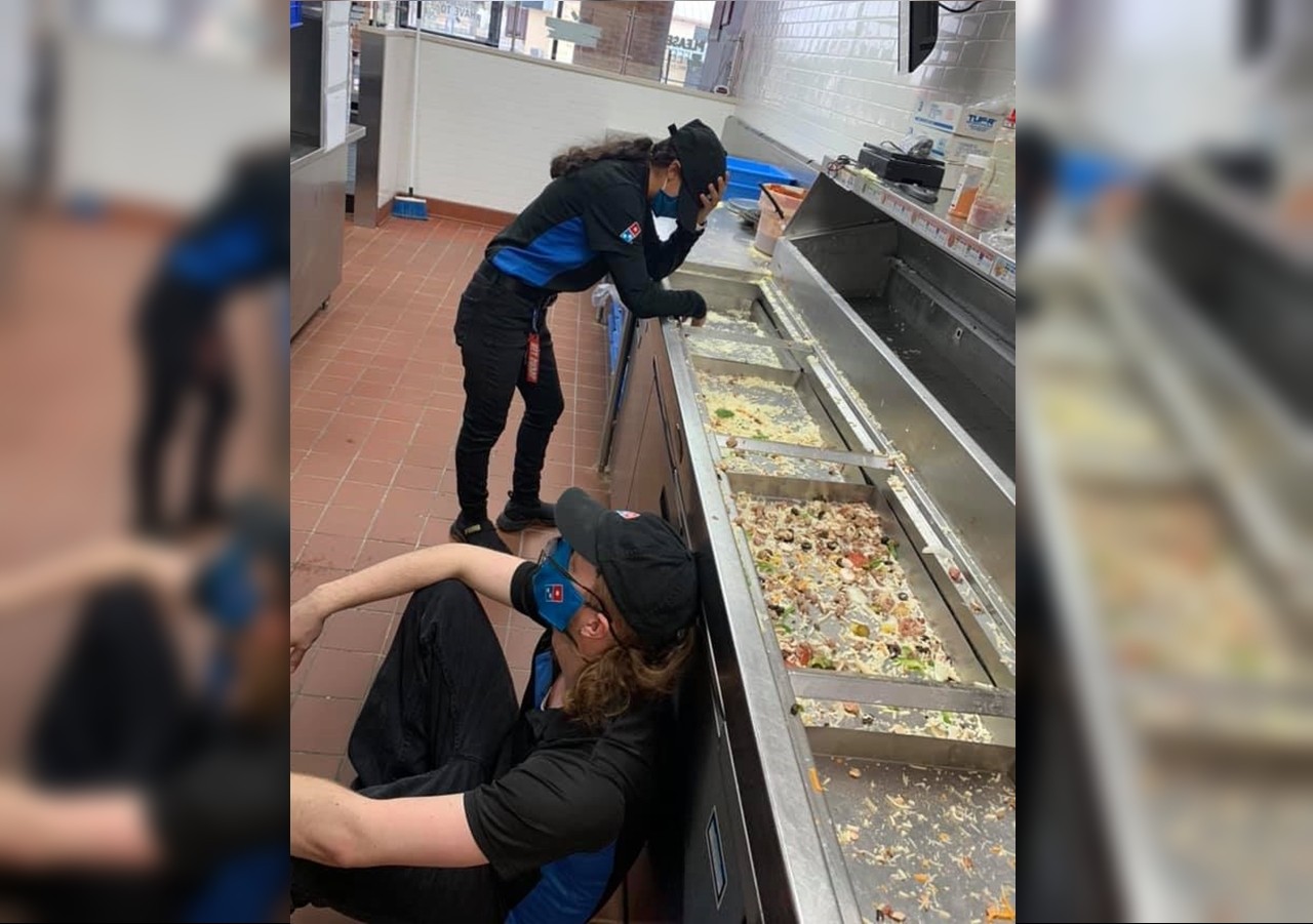 披薩店店員July DeLuna在臉書上傳一張,他們忙到累癱在工作台上的照片,表示由於附近所有的披薩店都關了,他們開店後就接到無數的訂單、無數的催促電話,還有人對他們大吼大叫,就是希望能快點拿到食物,也因此他們原本準備賣到周末的食材,短短4個小時內就全數賣光。
