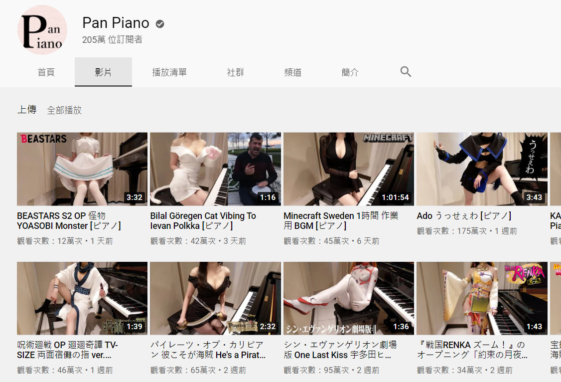 YouTube鋼琴家「小p的音樂工房」(Pan Piano)多部彈奏影片累積不少粉絲,讓紳士及愛好音樂的網友都群聚於此,訂閱人數也不斷飆升,如今來到205萬,與知名YouTuber「Joeman(九妹)」並肩,彷彿有即將超過的趨勢。