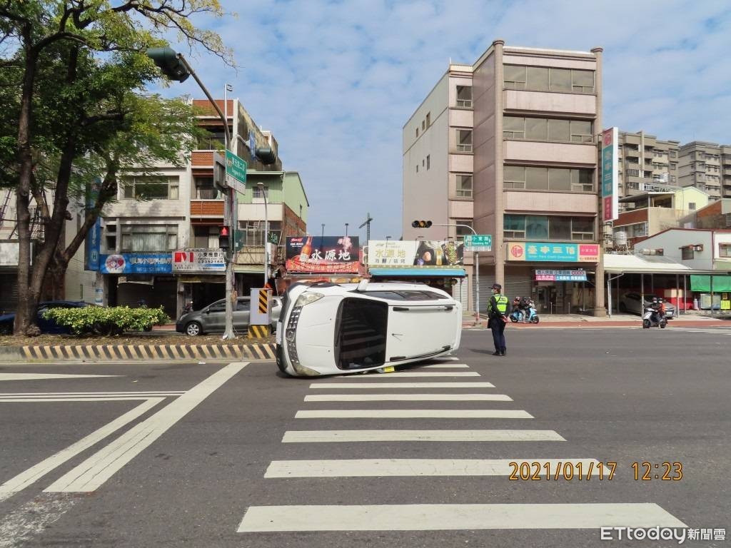 ▲台南市謝姓男子因閃避一名闖紅燈之機車騎士而撞上安全島導致車輛翻覆,網友多認謝男是自撞,謝男家屬憤而求助警方,查出肇事人還他清白公道。(圖/記者林悅翻攝,下同)