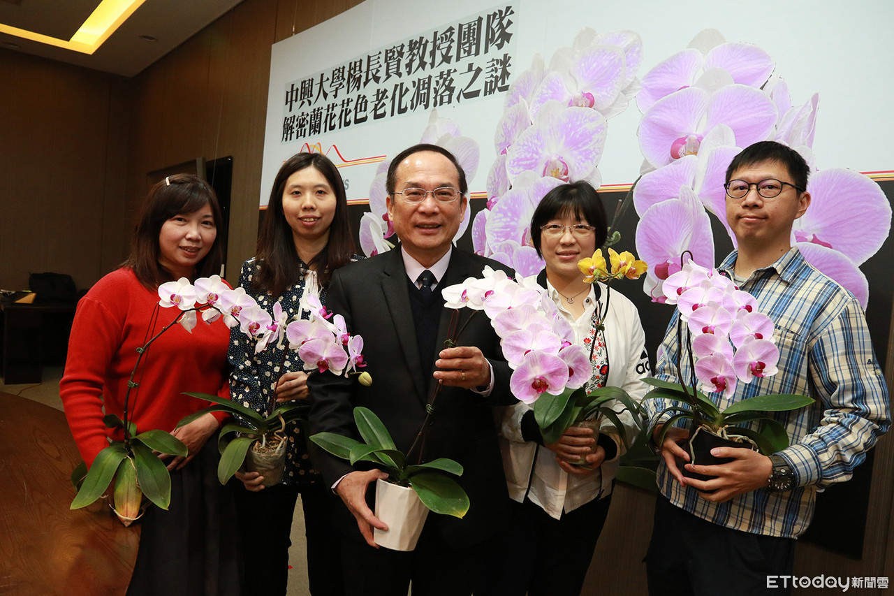 ▲中興大學副校長、生物科技學研究所講座教授楊長賢(中)所領導的團隊解開蘭花花色及老化之謎。(圖/中興大學提供)