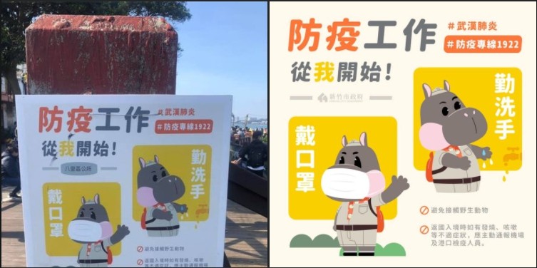 新北市八里區公所委託製作防疫宣導告示牌,廠商誤用新竹市的行銷大使河馬「樂樂」圖案。八里區長陳炳仲今天晚上與創作者張永昌聯繫表達歉意,同時緊急撤除宣導告示牌。