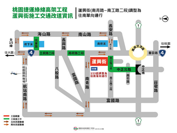 桃園捷運綠線GC01標高架段工程施工,2月23日起將於蘆竹區蘆興街(南青路~南工路二段)進行第一階段施工圍籬架設,施工期間道路縮減,蘆興街將調整為往南單向通行(南青路進南工路出),工區速限30公里,提醒市民朋友行經該路段時放慢車速,或配合改道通行。