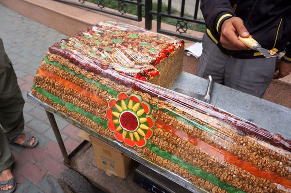 這東西的名稱叫做切糕,又有別名稱作瑪仁糖,是新疆維族人的傳統食物之一。有客人需要時老闆會直接從中切下一塊一塊來賣,所以名稱就由此而來。不過這東西的價錢卻高得嚇人,還是遠觀就好了。