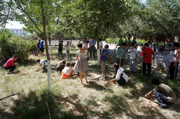 路牌上顯示,過柳毛彎之後就剩下一些稱為"團場"的地名,再來就是百里外的克拉瑪依了。對於團場的認識實在太有限,不知道是不是一般的城鎮,所以保險起見今天就在此過夜。多出來的時間剛好可以去找學校來一起辦個種樹活動,於是就來到柳毛灣中學。