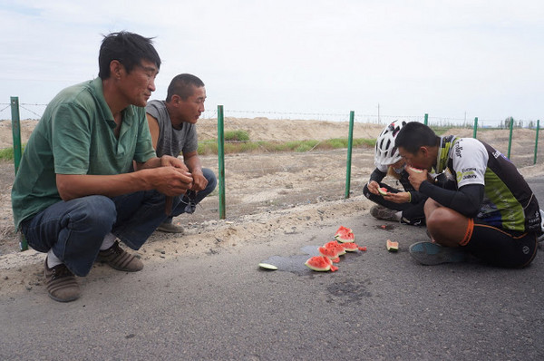 時間一晃就中午了,無盡的公路後卻遲遲不見武洋騎車的身影,只好就地而坐吃起帶在身邊的糧食當午餐。有輛載著西瓜的卡車開道我們前面路肩上停下來,車上走下兩位高大壯碩的男子,竟然跑來跟我們聊起天來!