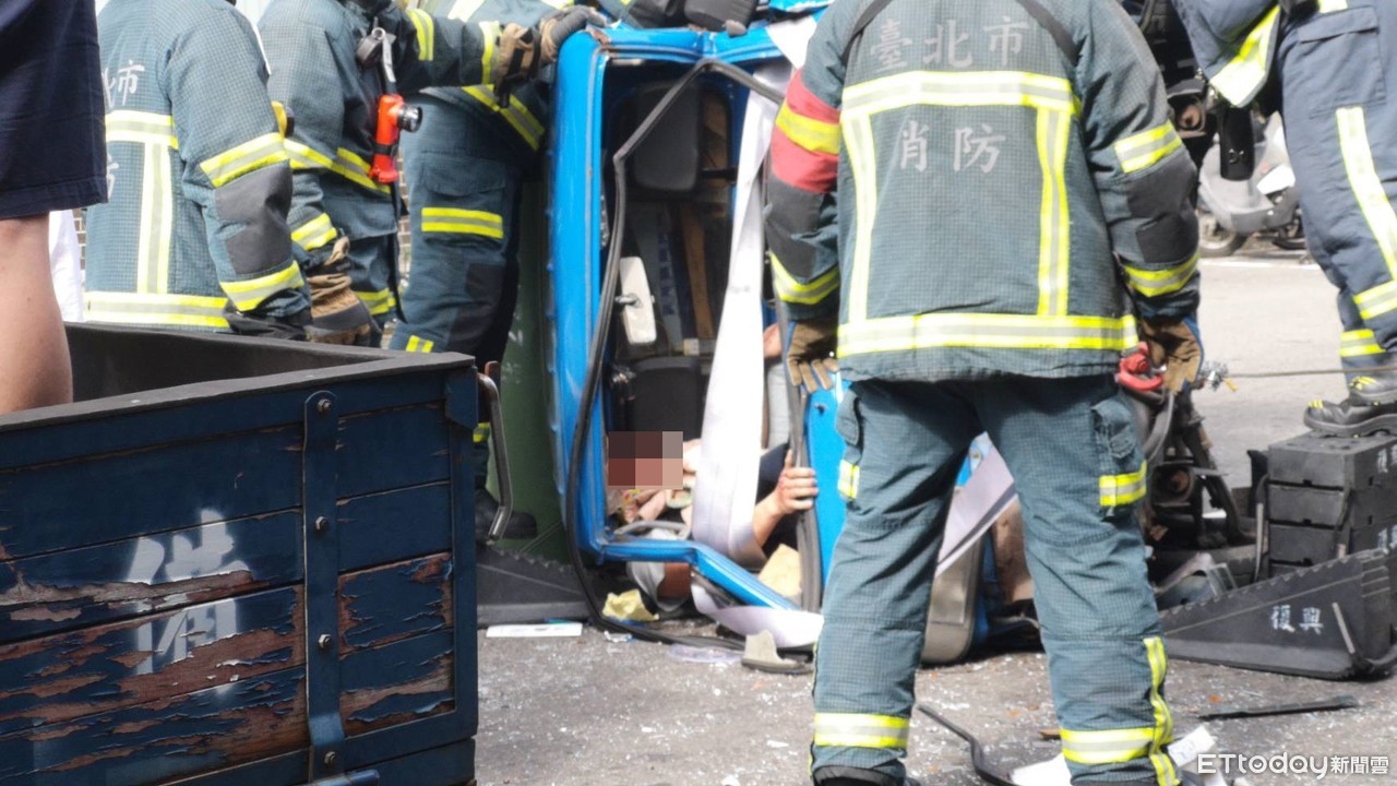 ▲師大路一輛發財車因撞上停等紅燈的貨車翻覆,駕駛受困車內。(圖/記者黃彥傑攝,下同)