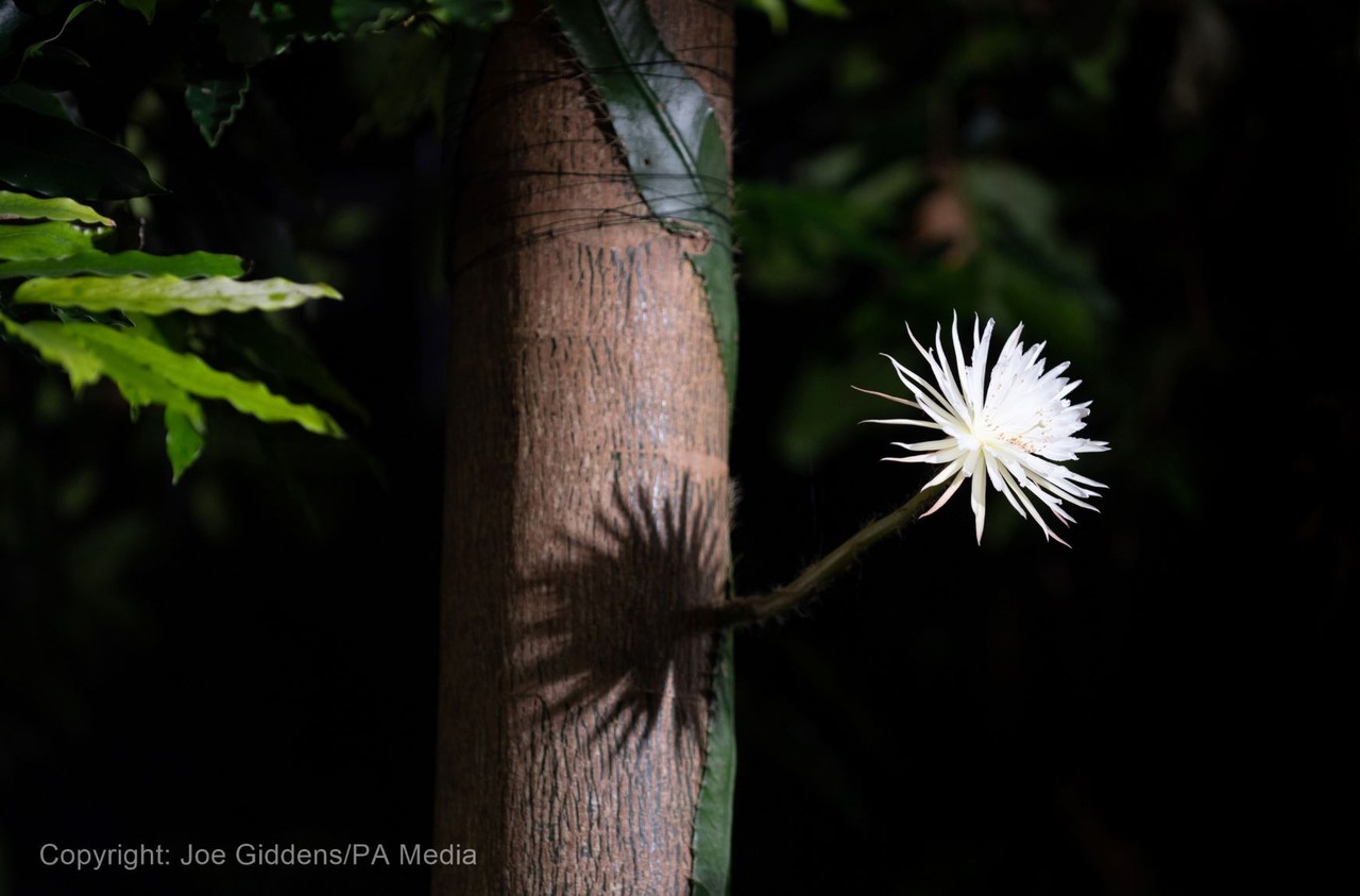 來自亞馬遜雨林的仙人掌花「月之花」,全球目前只有13個植物園種植,該品種花期只有短短12小時,非常短暫,且通常在日落和日出之間開花,因此被視為突破黑暗時期的象徵,尤其在新冠疫情嚴峻之際,園方認為此刻花開有著好兆頭的意味。