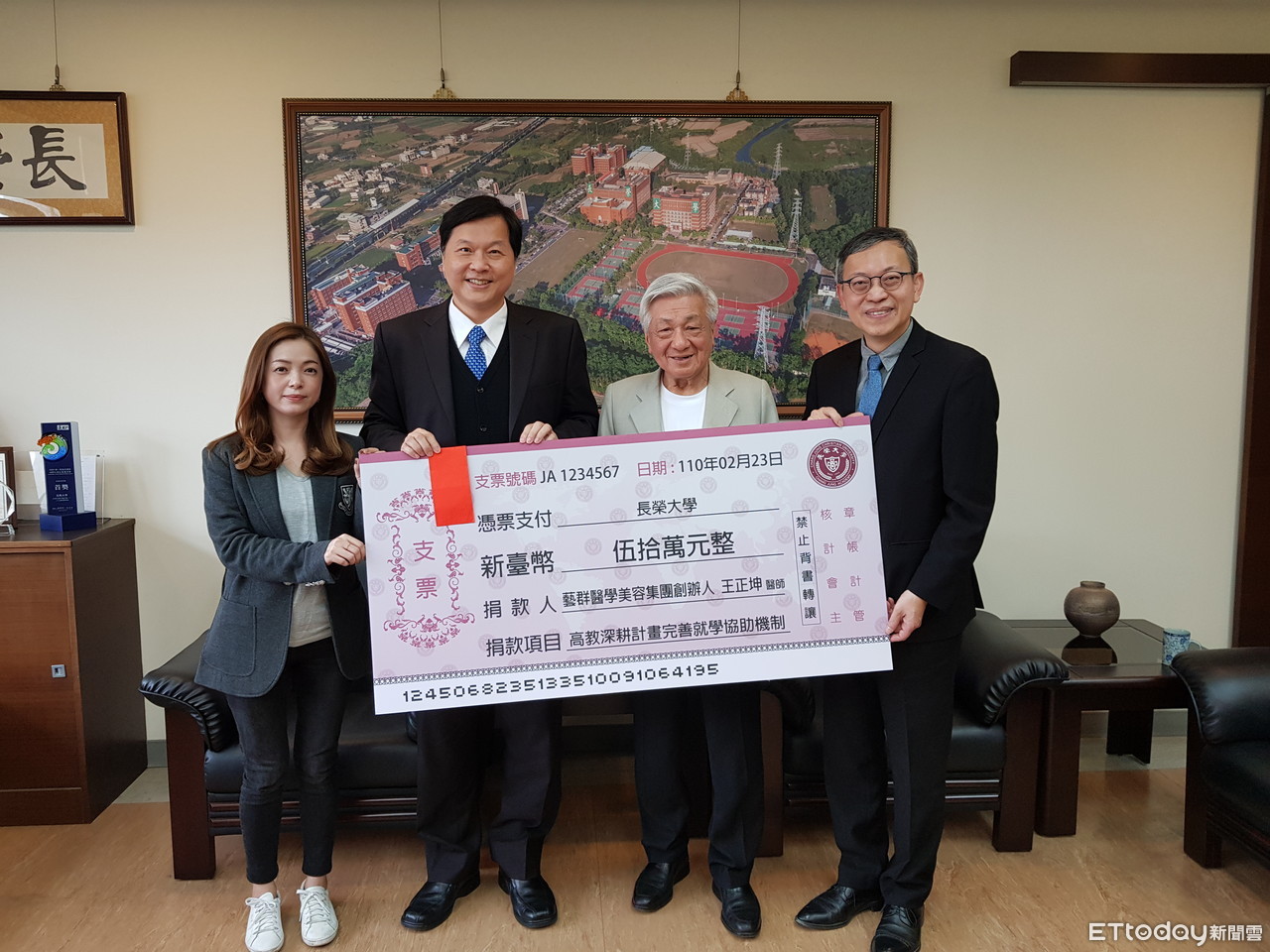 ▲藝群醫學美容集團總裁王正坤醫師(左二),捐贈長榮大學50萬元,幫助經濟弱勢學生。(圖/記者林悅翻攝,下同)
