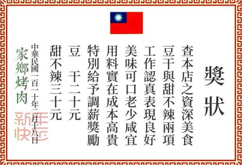 該烤肉店18日在粉絲專頁貼出一張獎狀照,獎狀上寫著「查本店之資深美食豆干與甜不辣兩項 工作認真表現良好 美味可口老少咸宜 用料實在成本高貴 特別給予調薪獎勵 豆干二十元 甜不辣三十元」。店家還在貼文中表示「本屆的家鄉國片金炭獎 由《烤味》主角『甜不辣』 與《消失的中秋節》主角『豆干』獲得調薪榮譽。」