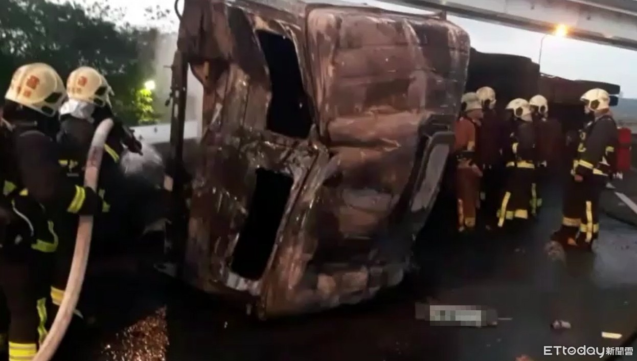▼火燒聯結車,所幸40歲王姓駕駛及時脫困,詳細事故原因有待警方調查。(圖/記者陳雕文翻攝)