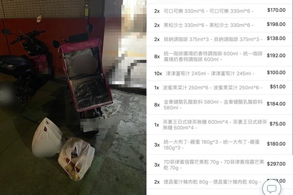 從截圖中可見,客人訂單達1656元,包括12罐可樂、12罐沙士、14罐咖啡、10罐蘆筍汁、6罐果菜汁、8罐乳酸飲料、4瓶綠茶、3組布丁、3包芒果乾及2包豬肉乾;重點是,事後還在訊息上更正地址,並強調「請走到後面的樓梯再往上走。」