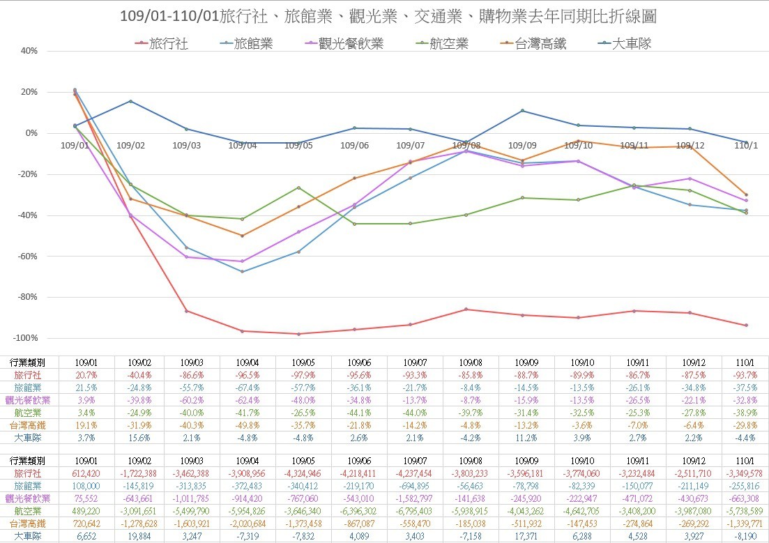 靜宜大學觀光學系副教授黃正聰統計觀光產業去年與前年營業績效比較,其中旅行業最慘,自3月起營業額大暴跌,每月幾乎都衰退約90%,由於國境持續封鎖,今年1月仍衰退93.7%。