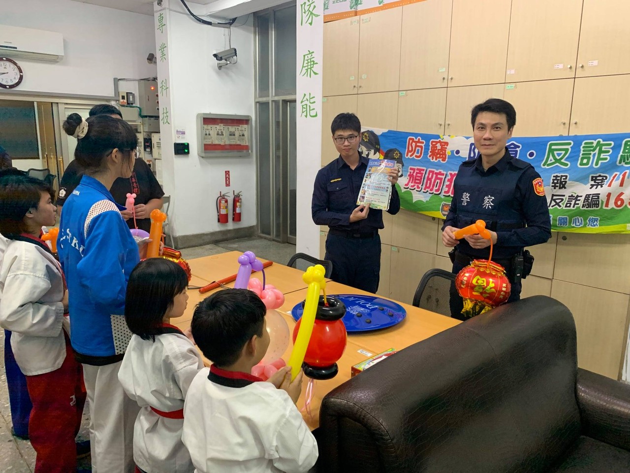 此外,中埔所於正月十五日元宵節,另邀請轄區跆拳道館內小朋友們,在中埔所內舉行反詐騙宣導活動,員警們除對小朋友們講解如何反詐騙預防外,也透過有獎徵答贈送氣球燈籠小禮物方式,加深小朋友們對反詐騙宣導的觀念。