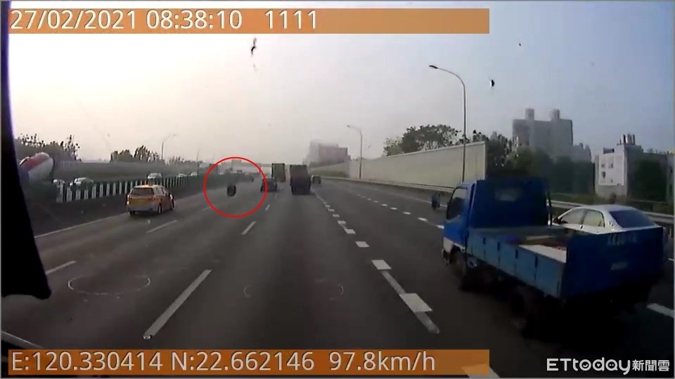 國道1號364.4K高雄段27日上午發生一起驚悚死亡車禍!一輛大型貨車行經該路段時,後輪突然脫落彈飛到對向車道,當場砸中一輛汽車右前方,導致副駕駛座的曾女當場腦漿外溢慘死,而事故當時的驚悚畫面也隨之曝光,短短1分多鐘時間,奪走一家四口女主人性命,也讓人不勝唏噓。