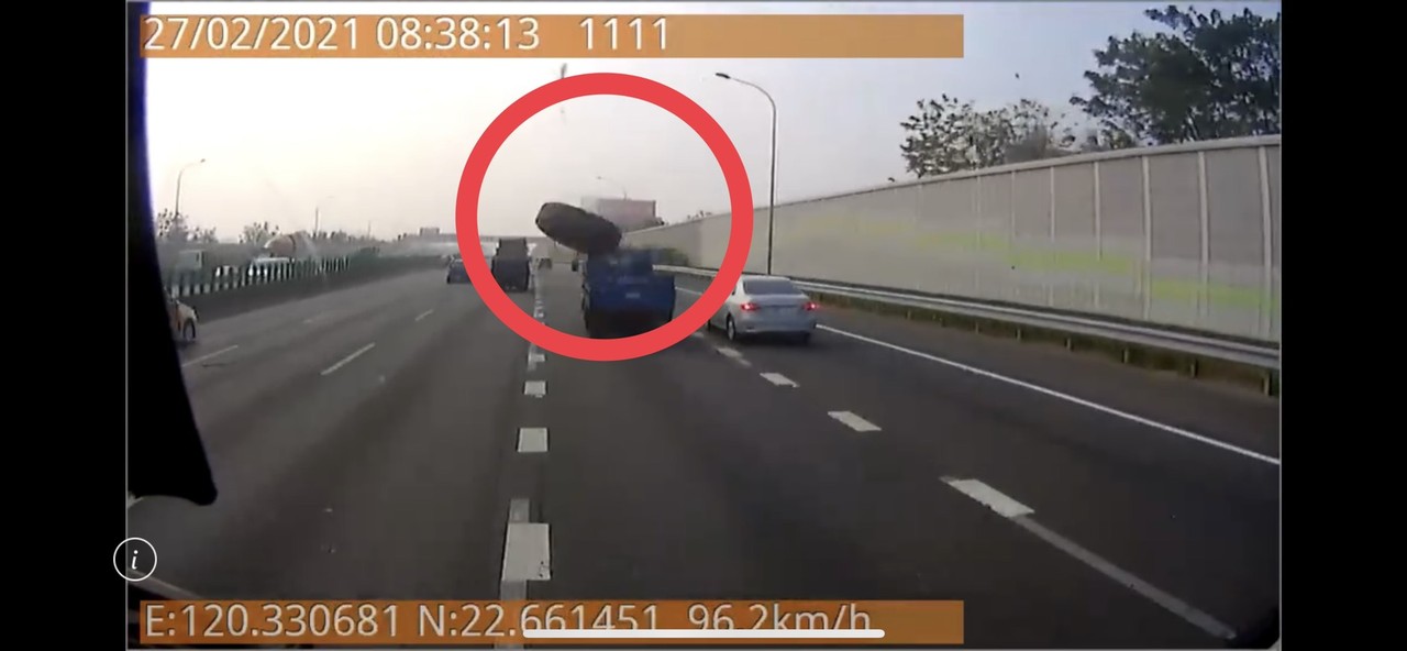 國道1號228連假首日發生離奇死亡意外!一輛聯結車今天上午行駛在國道一號364.4公里高雄段,後方拖車上的巨大輪胎突然脫落,其中一顆彈到對向南下車道,砸到一輛由中線切到內側車道的自小客車右前方,造成坐在副駕駛座的女乘客當場沒了呼吸心跳,警方表示,大貨車脫落的輪框跟輪胎約160公斤,經過物理老師的換算「160公斤的巨輪從天而降,小客車等於受到4.5噸的大卡車迎面撞擊一般。」