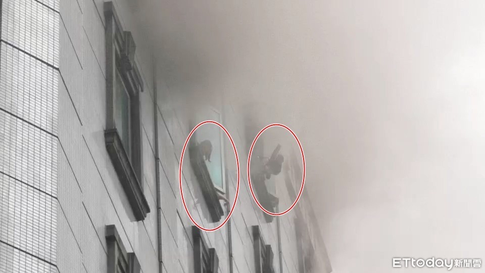 ▲先前台北中山區林森錢櫃大樓火警,民眾受不了濃煙整個人站在牆外,狂揮手、甩外套向外求救。(紅線圈起處)。(圖/記者黃彥傑攝)