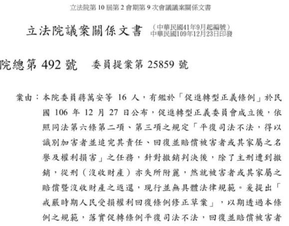 蔣萬安提案修正條文指出,有鑑於「促進轉型正義條例」於民國106年12月27日公布,促進轉型正義委員會成立後,依照同法第六條第二項、第三項之規定「平復司法不公,得以識別加害者並追究其責任、回復並賠償被害者或其家屬之名譽及權利損害」之任務,針對撤銷判決後,除了主刑遭到撤銷,從刑(沒收財產)亦失所附麗,然就被害者或其家屬之賠償暨沒收財產之返還,現行並無具體法律規範。