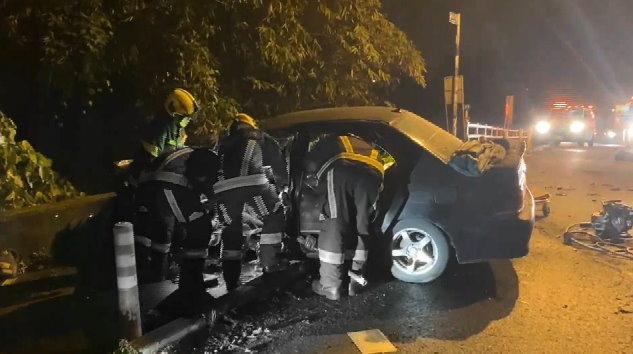 事發於連假第二天凌晨4時多,由於撞擊力道太大,車頭全毀、輪胎也噴飛。警消為了要救人,從兩側車窗爭取出空間,將駕駛座的男大生救出,而副駕駛座的女大生自行脫困;警消直接把長背板插進後座,再將乘客送醫治療。
