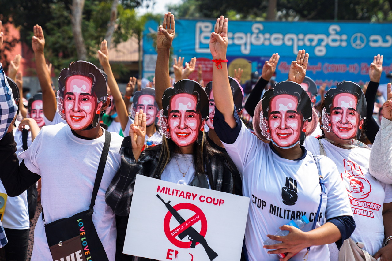 抗議聲浪蔓延全國各地,仰光民眾上街頭高喊口號,警方則出動高壓水砲及軍用車輛。西北部城鎮吉靈廟(Kale)的示威者高舉翁山蘇姬的照片喊道,「民主是我們的事業,我們的事業!」臉書上的直播影片可見,一小群戴著安全帽的民眾聚集在東北部臘戌,在警察向他們行進時高喊口號。