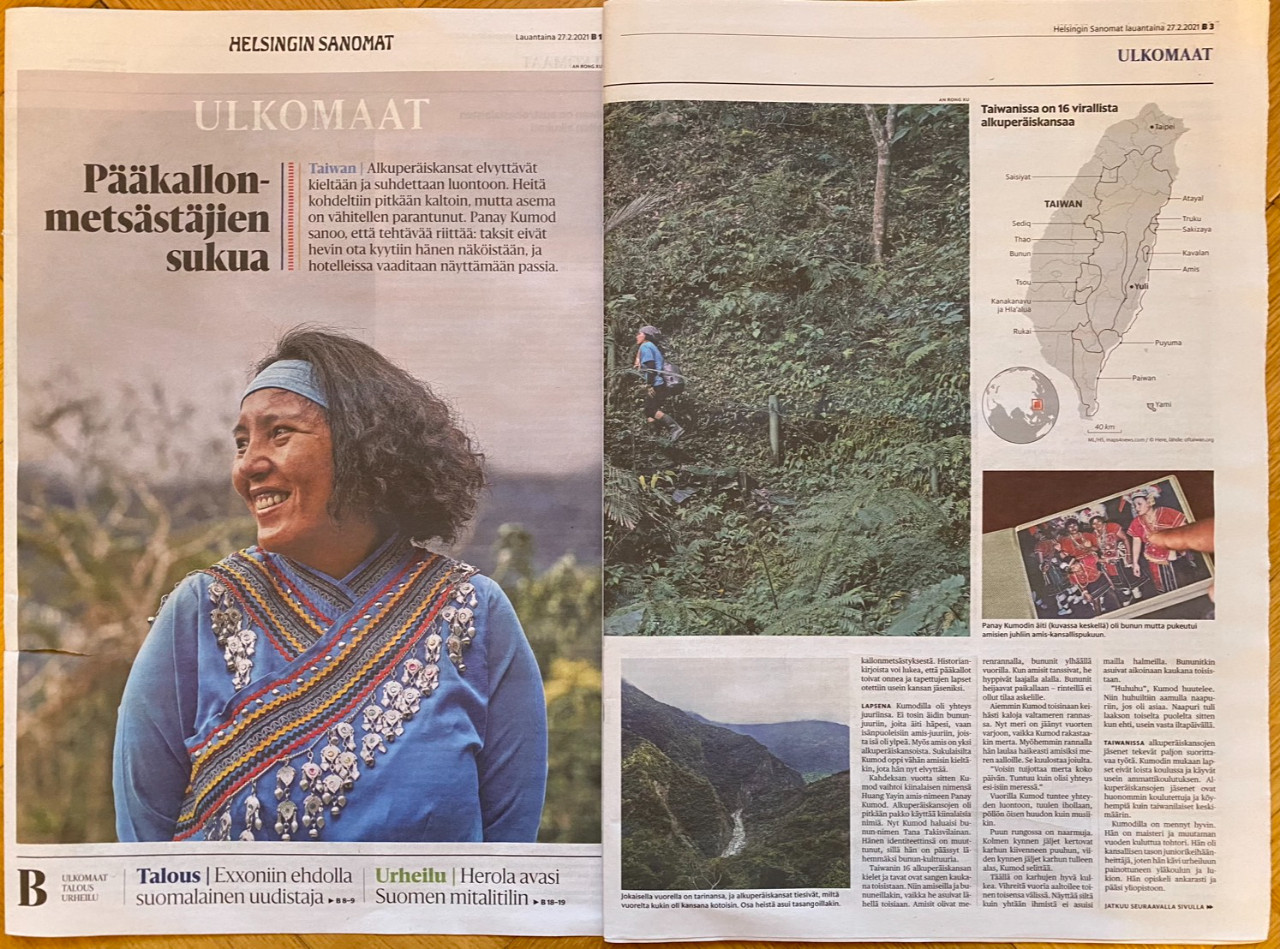 芬蘭第一大報「赫爾辛基日報」(Helsingin Sanomat)於2月27日介紹台灣原住民族。帶讀者認識台灣原民的族群認同、語言復振、部落傳統、生態智慧及性別議題。