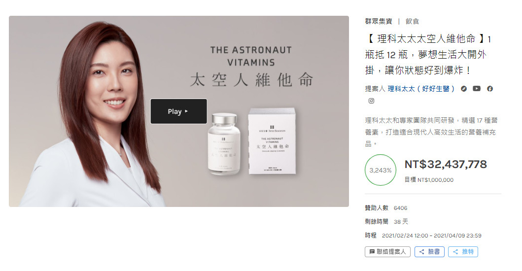 理科太太及生醫團隊在平台募資的綜合維他命膠囊,一開始集資目標為100萬元,沒想到經過一週的時間後,截至截稿時間,集資金額已達到32,437,778元,達標率破3243%。