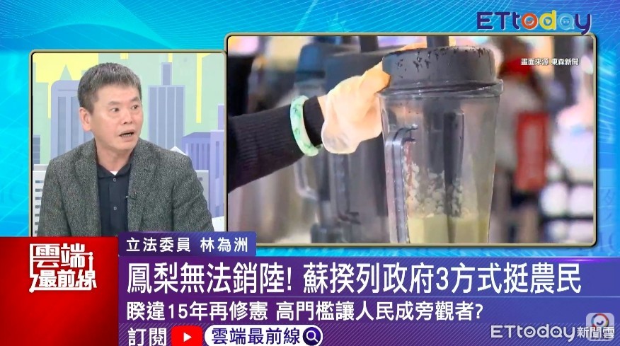 中國大陸以台灣鳳梨檢出介殼蟲為由,宣布3月1日起暫停台灣鳳梨進口,引發熱議。對此,國民黨立委林為洲2日在ETtoday《雲端最前線》節目中直言,應該趁這機會將相關問題看清楚,大家也要好好想想解方、幾個路徑,「比如說跟中國大陸談判也是一個」;如今對方丟出檢疫這個理由,「那我們就展開檢疫的談判」。