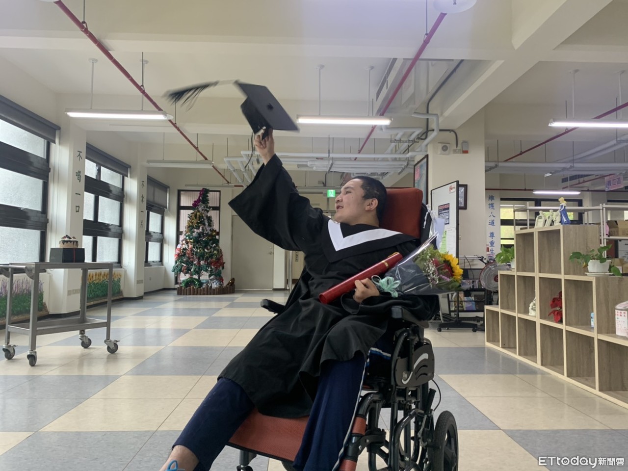 ▲創世台東院第1位甦醒的植物人,穿著畢業服喜迎新生。(圖/記者楊漢聲翻攝)
