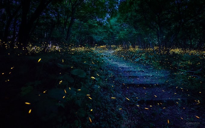 說到日本的美麗風景,你會想到春日漫天飛舞的櫻花、深秋緋紅如火的楓葉,或是寒冬時期闃寂銀白的霜雪呢?當然上述所言都是日本廣為人知的美景,不過日本著名的攝影師和CG藝術家Yutaka Kagaya(又名KAGAYA)捕捉到了專屬於夏季的美麗畫面──日本姬螢火蟲在夜間繡球花的周圍翩翩起舞、螢光點點遍野漫散的夢幻場景。