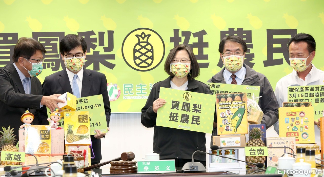 對於大陸禁止台灣鳳梨進口,民進黨3日中常會前舉行記者會,由總統蔡英文率領嘉義縣長翁章梁、台南市長黃偉哲、高雄市長陳其邁與屏東縣長潘孟安一起賣鳳梨。在記者會上,陳其邁開玩笑說,要把民進黨徽「台灣」圖像,改成「鳳梨」以示力挺,蔡英文聽聞後大讚首長們不僅會選舉,還蠻會賣鳳梨的。