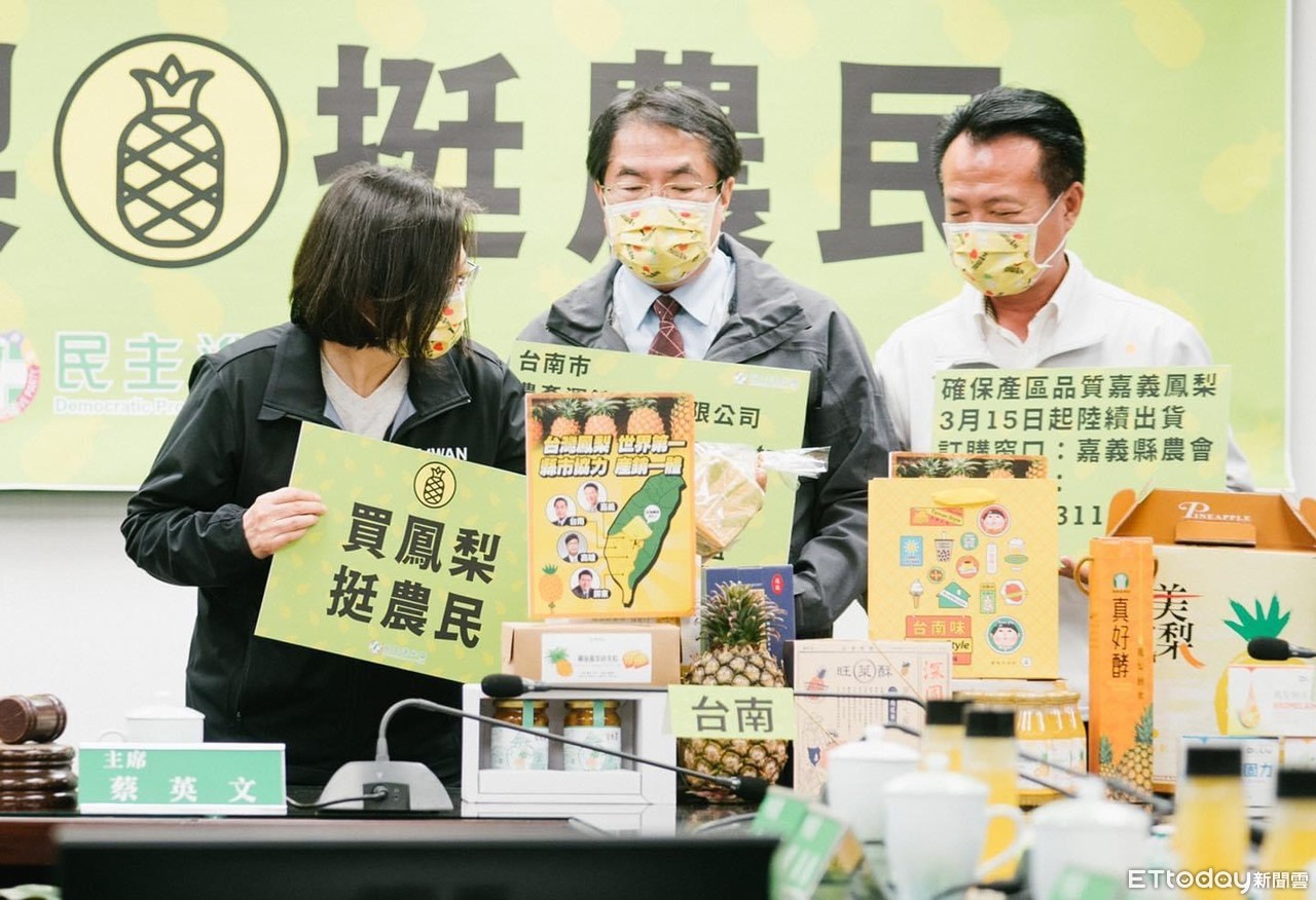 民進黨南部4位執政縣市長,3日到民進黨中常會訴求「買鳳梨,挺農民」,台南市長黃偉哲親帶優質台南鳳梨及相關產品北上,兼民進黨主席的蔡英文總統仔細研究桌上滿滿鳳梨商品,驚訝地說:「還有鳳梨吐司?」,黃偉哲說這是來自台南關廟鳳梨所製作的產品。