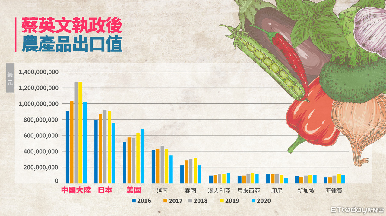 國民黨表示,不知陳吉仲從何解讀近5年農產品出口狀況,農委會農業統計資料查詢系統中,可以看到蔡政府一上任,我國農產品出口就嚴重依賴大陸,2017年後對日本的出口更是持續下降。