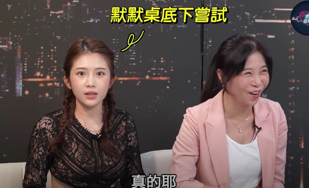 ▲雞排妹聽完後,立刻在桌底下實測。(圖/翻攝自YouTube/深夜保健室)