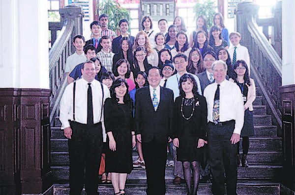 許明財偕教育處長蔣偉民、學管科長黃玉梅、新科國中校長彭元豐等歡迎由美國姐妹市庫柏蒂諾市交流協會理事長宋貞率領的教育交流團,希望在一週的交流互動中,紮根兩市邦交,也在25個接待家庭裡和同年齡的新竹孩子建立情誼,拓展國際視野,並瞭解文化內涵。