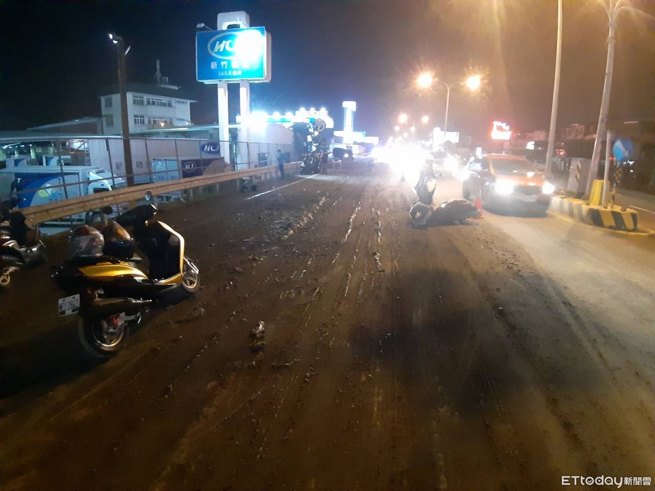 ▲台南市仁德區大同路三段5日晚上近8時左右,發生因水泥預拌車沿途掉落泥漿,造成地面泥濘,多台機車經過滑倒「犁田」,騎士受傷送醫。(圖/記者林悅翻攝,下同)