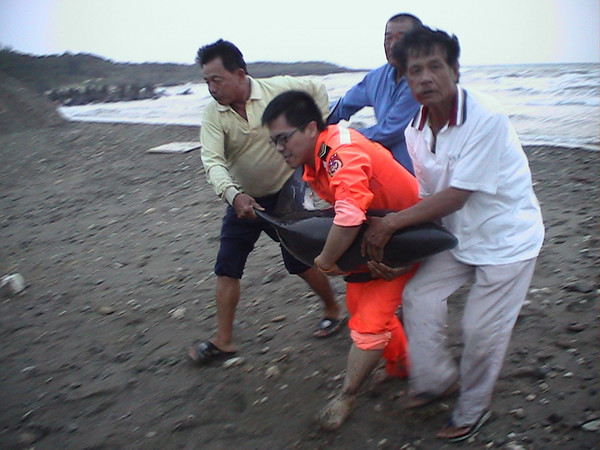 7隻小虎鯨14日晚間6時集體擱淺車城新街射寮溪出海口海灘,岸巡第六三大隊與車城消防人員漏夜救援,發現鯨豚尚有生命跡象,趕緊用濕布覆蓋鯨豚同時灑水保濕,交由成功大學海洋生物鯨豚研究中心王教授載回四草保育區醫護及擇期野放。